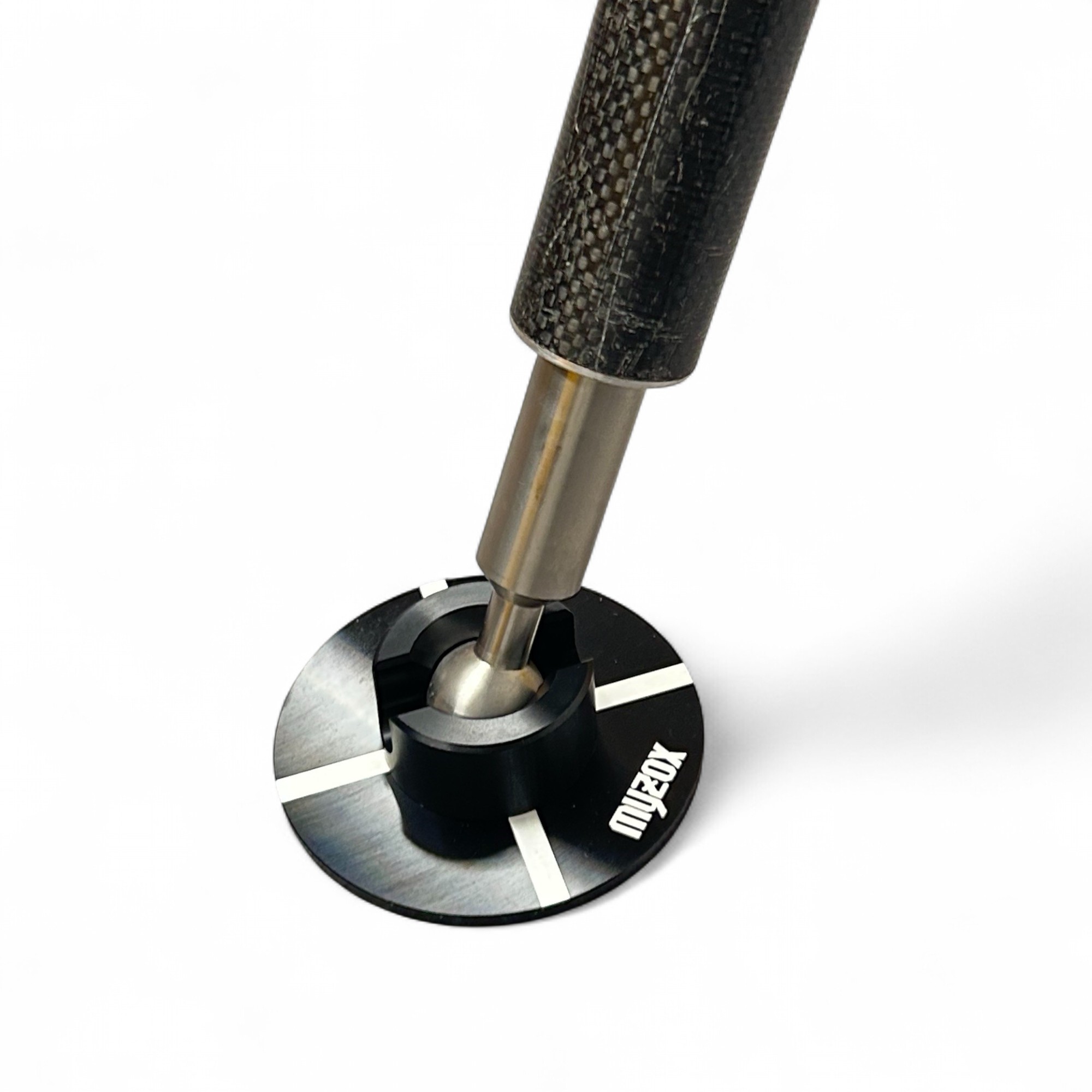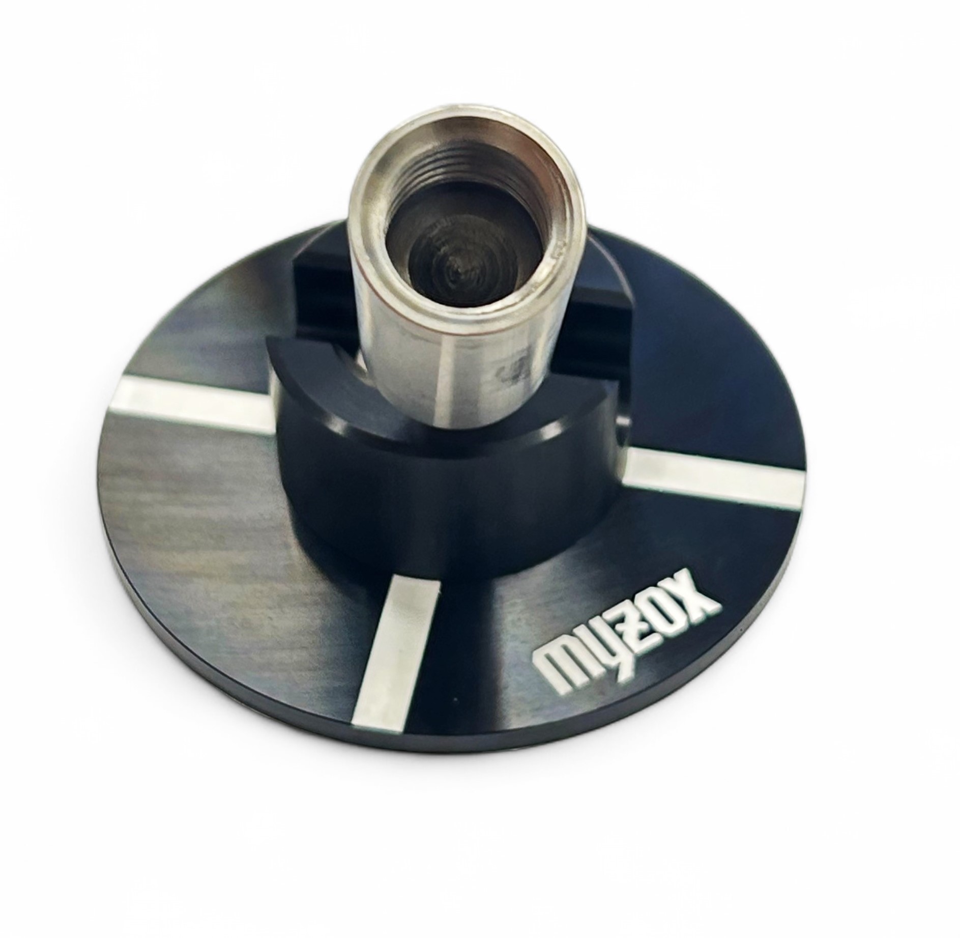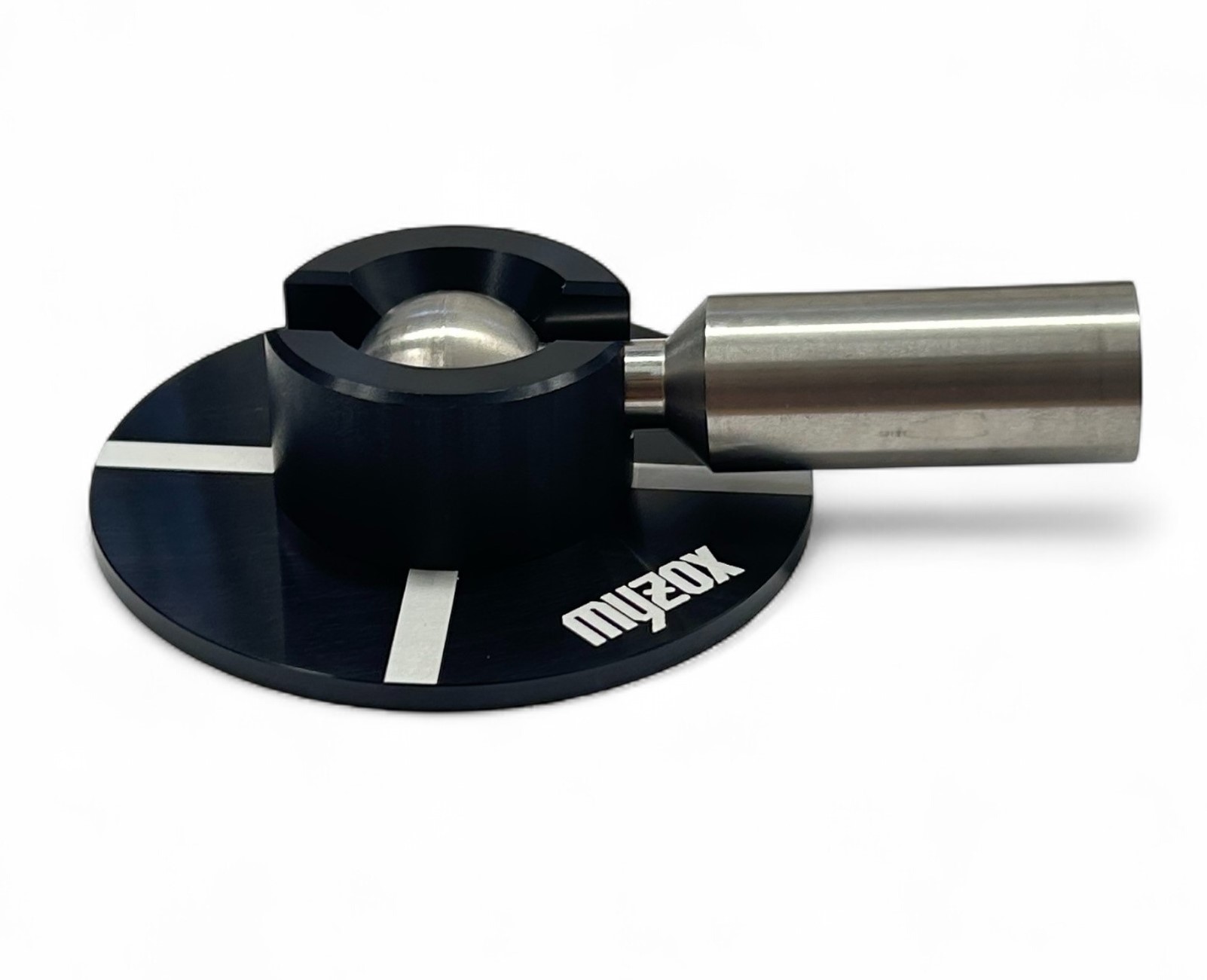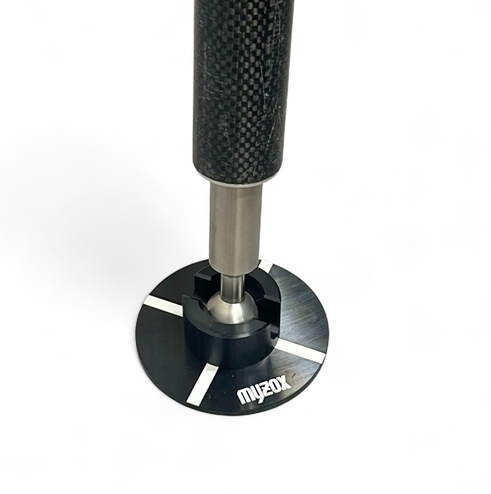 Hrot na tyčku s podstavcem a otčným adaptérem od firmy Myzox. Umožňuje tyčku naklopit až do úhlu 90° - vhodný do svažitých terénů.